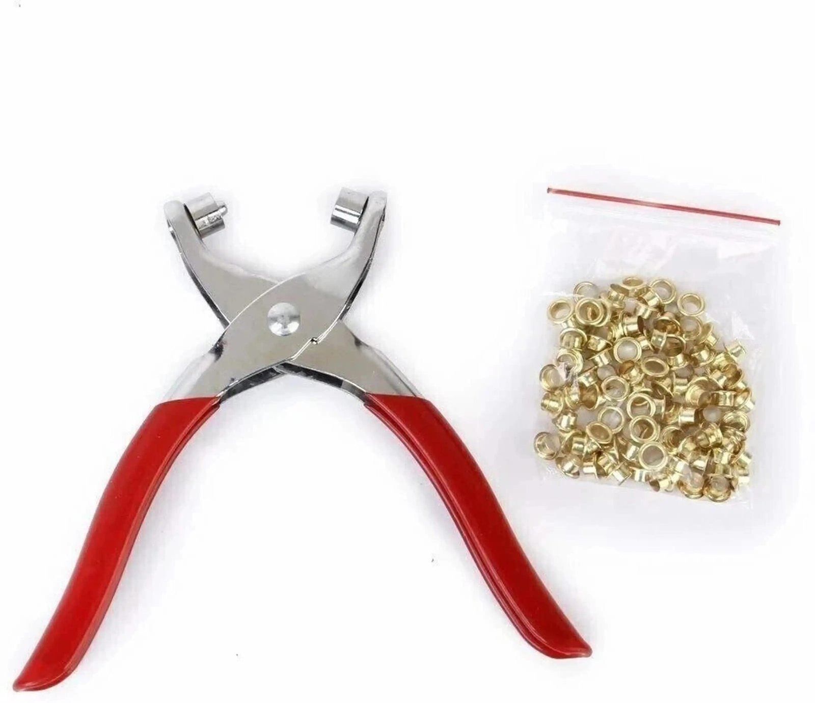 Hand grommet plier punching tool for making holes and fixing eyelets on fabric, tarpaulin and leather.