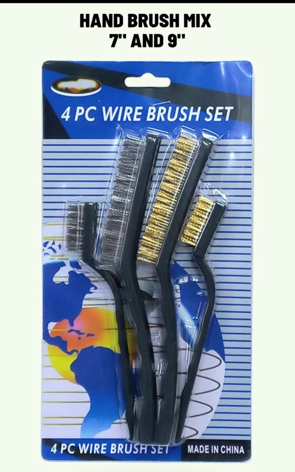 4 piece heavy duty wire brush set in 7 inch and 9 inch sizes for rust removal, paint cleaning and surface prep work.