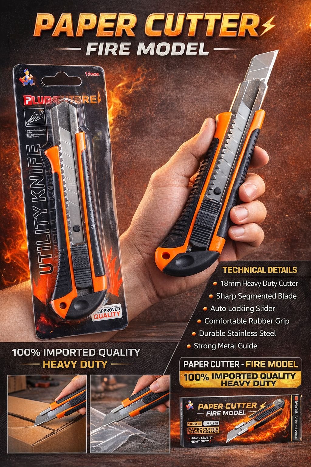Heavy duty 18mm cutter knife with plastic grip for cutting paper, cardboard, plastic sheet and packaging material.